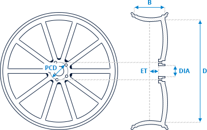 | Ширина обода (B) | Диаметр (D) | Рассверловка (PCD) | Вылет (ET) | Диаметр ступицы (DIA) |